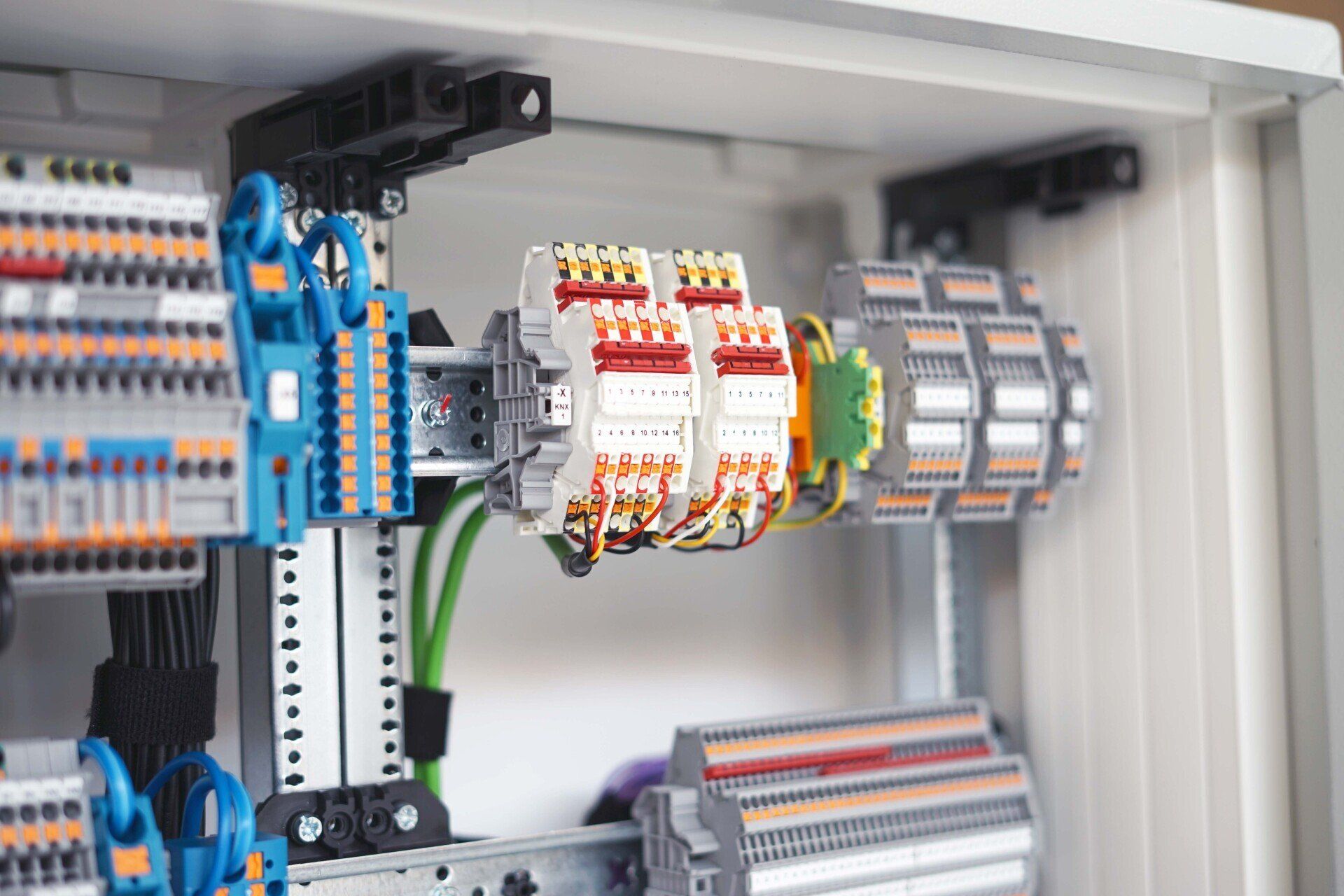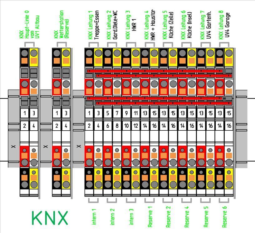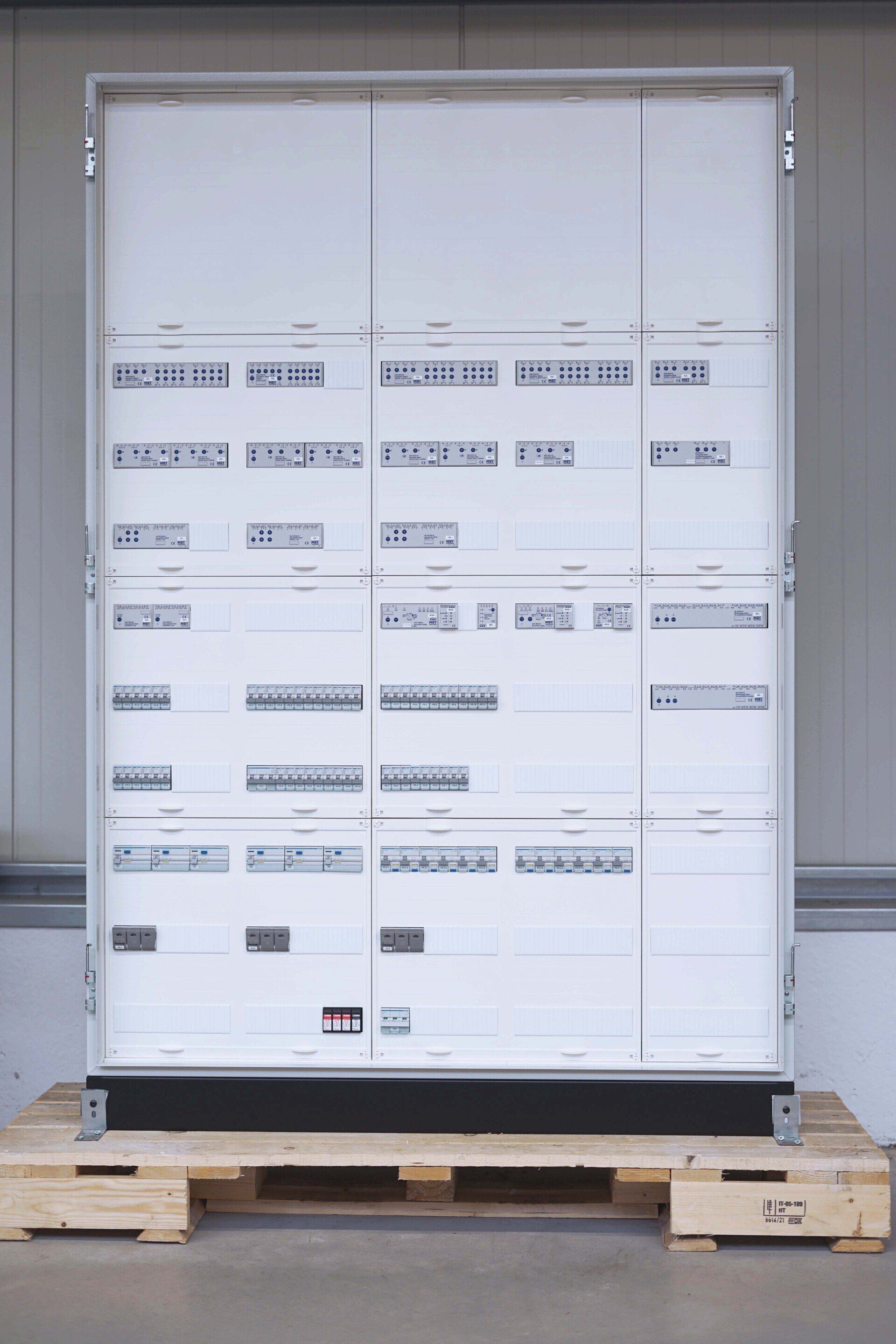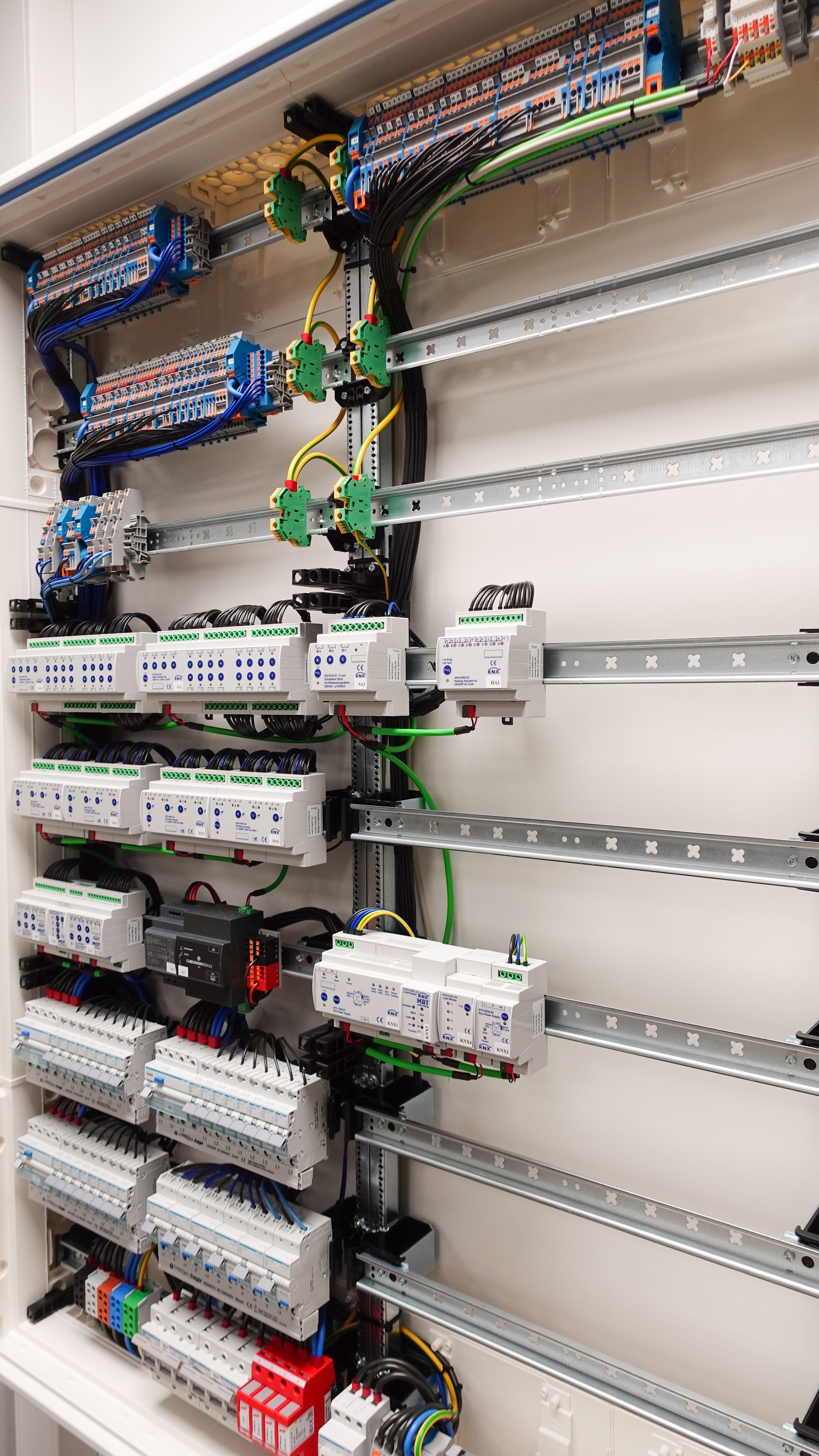 Ein KNX Schaltschrank ist ein Schaltschrank, welcher aus vielen hochwertigen KNX Geräten und Leitungsschutz-Geräten individuell zusammengestellt wird. Dieser sollte fachgerecht in einer geeigneten Montage-Werkstatt angefertigt werden (keinesfalls auf der staubigen Baustelle). Dafür ist auch ein gewisser Zeitrahmen, sowie die Verfügbarkeit aller Geräte und Kleinteile absolut notwendig.